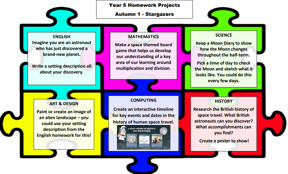 | Year 1 - Year 6 | Half termly homework jigsaws provide a range of homework projects for the children to complete and bring into school. Children may complete several chosen activities or all of the activities across the half term. Activities will include English, Mathematics and Science and three additional foundation subjects |